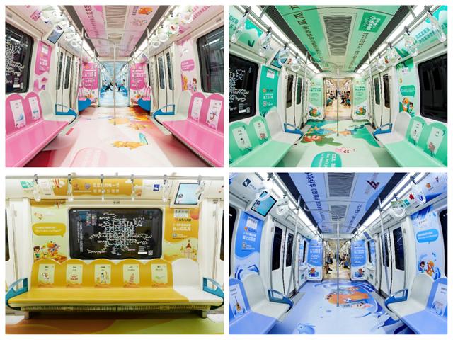 更值得关注的是,瓜瓜龙英语在北京10号线上打造了6节以"瓜瓜龙英语快乐课堂"为主题的超级内包车厢,通过车厢内海报、车门贴、座椅贴等品牌物料装饰出"粉、黄、蓝、绿"4种风格的沉浸式全景车厢,并配以瓜瓜龙英语的品牌简介、产品亮点等文案,让乘客在密闭的展示空间内对瓜瓜龙英语品牌产生深刻感知,也生动地传递出"瓜瓜龙英语的每一节,都是快乐课堂"的课堂理念。此外,色彩鲜亮的海报风格、可爱的品牌IP形象,使得瓜瓜龙英语主题车厢也成为10号线上一道"美丽的风景线",让暑期出行的小朋友们在地铁内恋恋不舍。