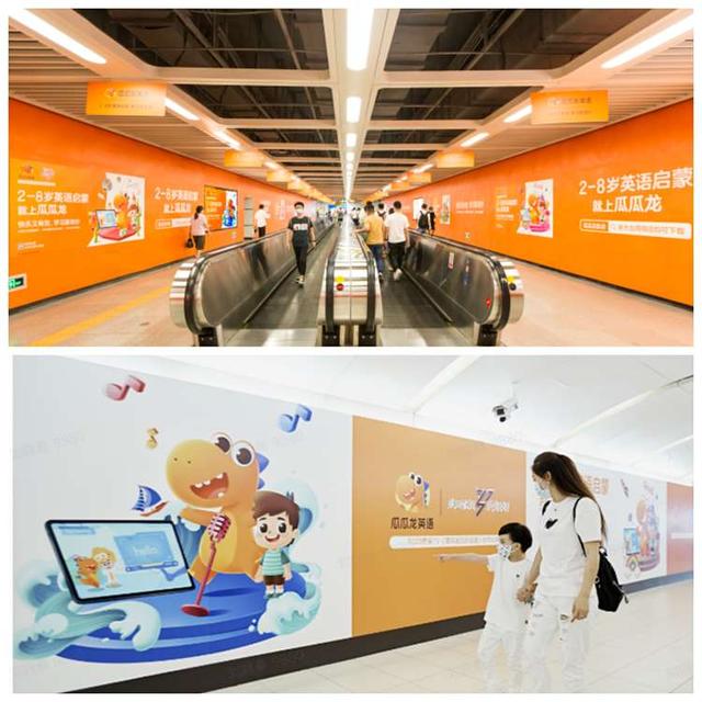据悉,瓜瓜龙英语在北京、深圳等城市地铁站点的换乘通道进行了双墙大全景的品牌海报展示,并在北京国贸站的电子屏幕上进行了品牌海报投放,强烈的视觉冲击让出行人群在不同方向的进出站及换乘路段都能被"瓜瓜龙英语"等品牌字眼吸引注意力,达到了极高的传播到达率。