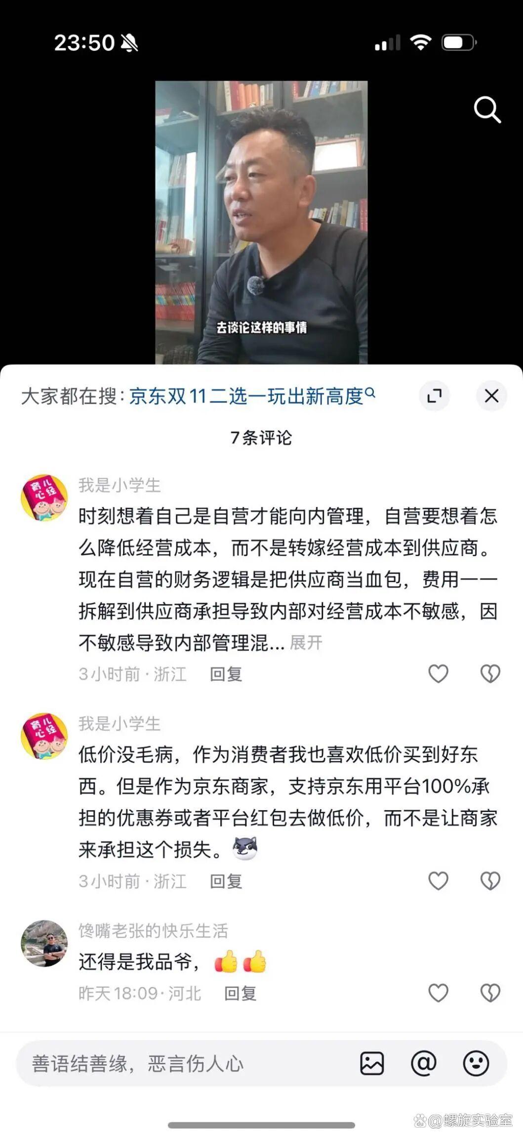 不过相较于京东员工的自我感动,商家似乎并不买单,有商家直接在王立品的视频中留言:你可以维护京东用户利益,但请用京东自己的成本,而不是转嫁给我们。