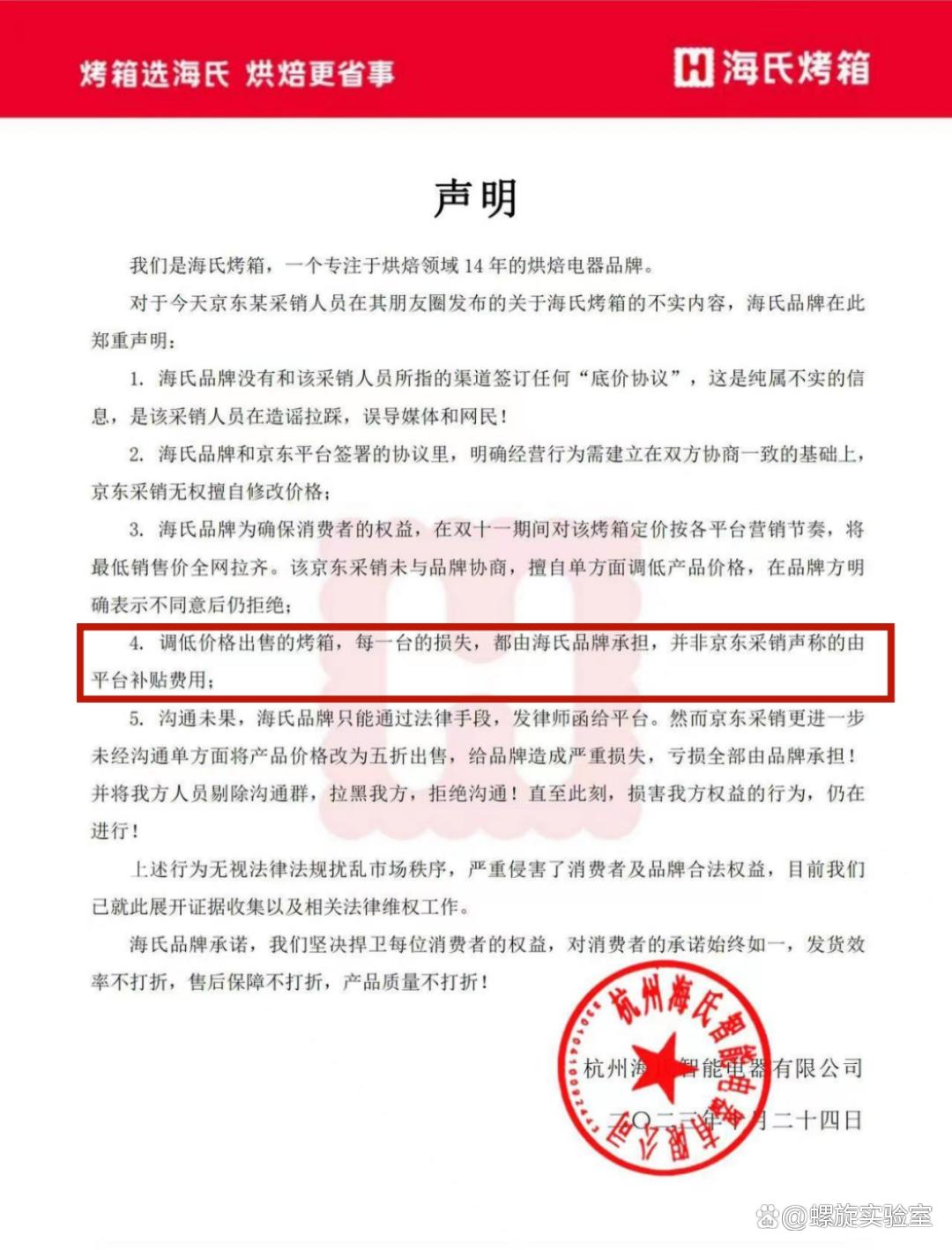 2023年双11,知名电器品牌海氏曾发布声明称,京东平台强行补贴压低了品牌商品的统一定位,导致店铺价格混乱,而且降价背后是品牌自行承担损失,并非此前声称的“平台补贴”。