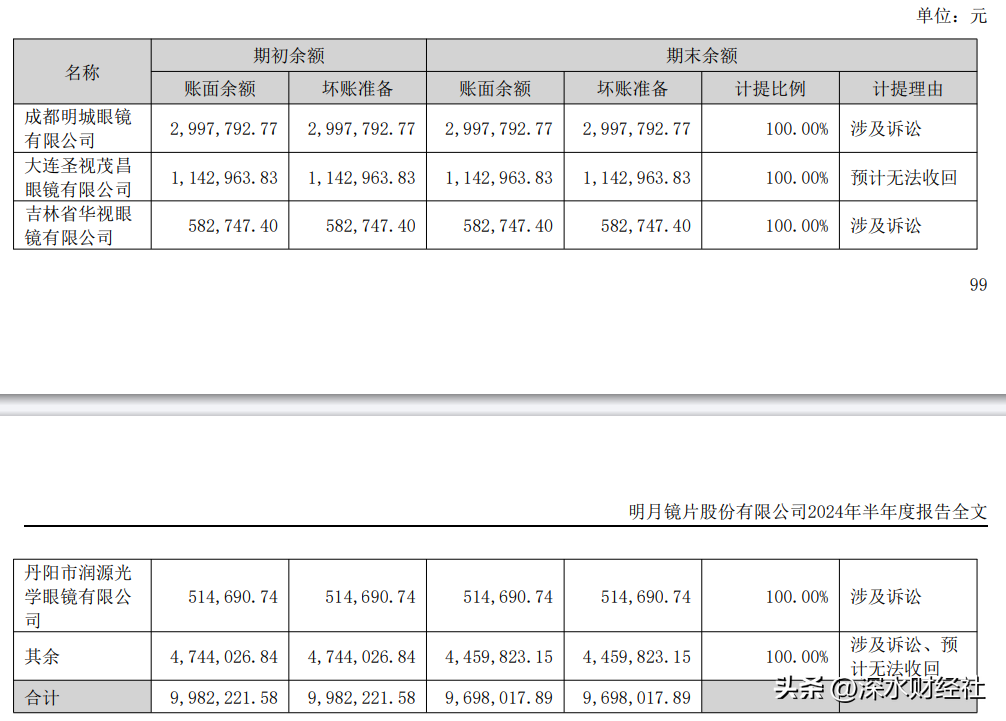 明月镜片在半年报中表示,上述4家客户计提比例均为100%,计提原因皆为涉及诉讼、预计无法收回。