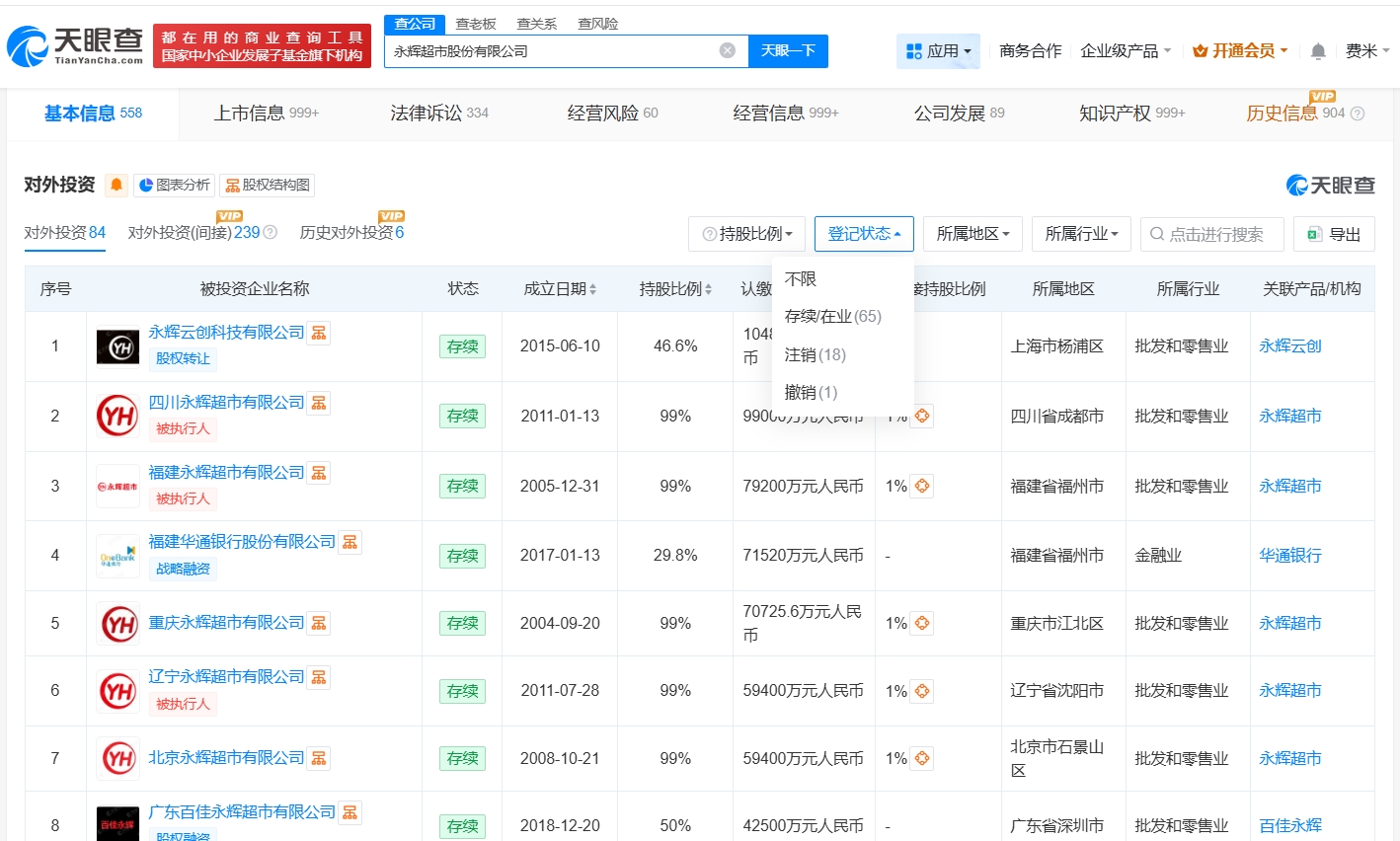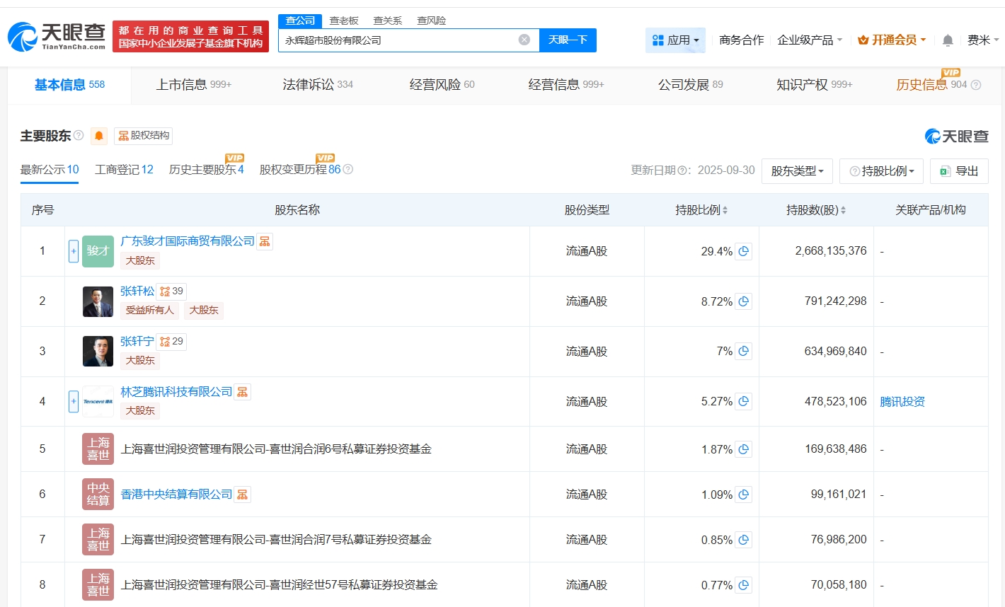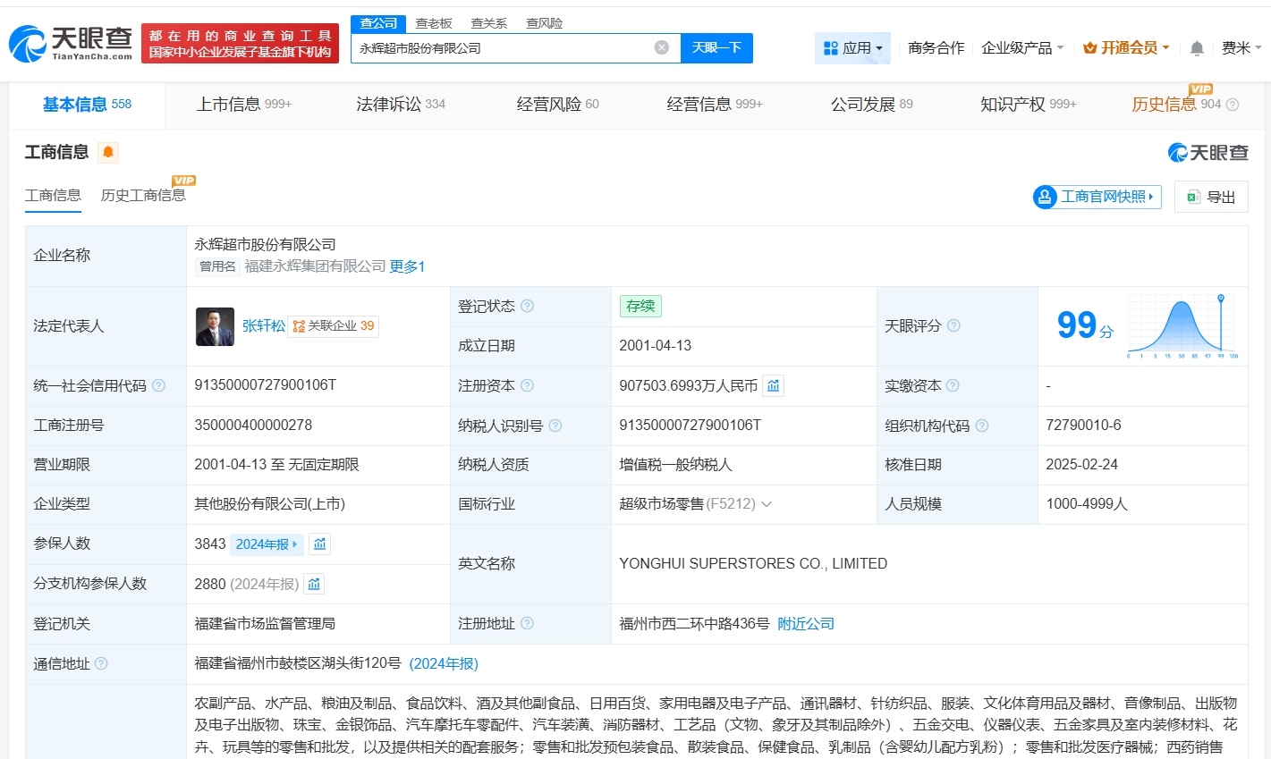 天眼查App显示,永辉超市股份有限公司成立于2001年4月,法定代表人为张轩松,注册资本约90.8亿人民币,经营范围包括网上贸易代理、互联网零售、信息服务业务等,由广东骏才国际商贸有限公司、张轩松、张轩宁等共同持股。对外投资信息显示,该公司对外投资80余家企业,其中60余家处于存续状态,包括永辉云创科技有限公司、四川永辉超市有限公司等,其他10余家企业已注销。历史被执行人信息显示,该公司近一年已被多次执行。