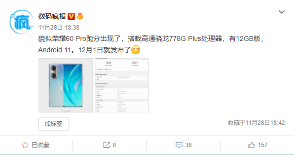 据知名数码博主@数码疯报 最新发布的信息显示,该机基本可以确认就是即将与大家见面的全新荣耀60 Pro,结合此前的相关爆料。