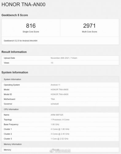 据知名数码博主@数码疯报 最新发布的信息显示,这款型号为TNA-AN00的荣耀新机将搭载全新的高通骁龙778G Plus处理器,辅以12GB内存,运行Android 11系统。结合此前的相关爆料,该机基本可以确认就是即将与大家见面的全新荣耀60 Pro。从GeekBench平台显示的数据来看,骁龙778G Plus单核得分816分,多核得分2971分,相比骁龙778G有较为明显的提升。