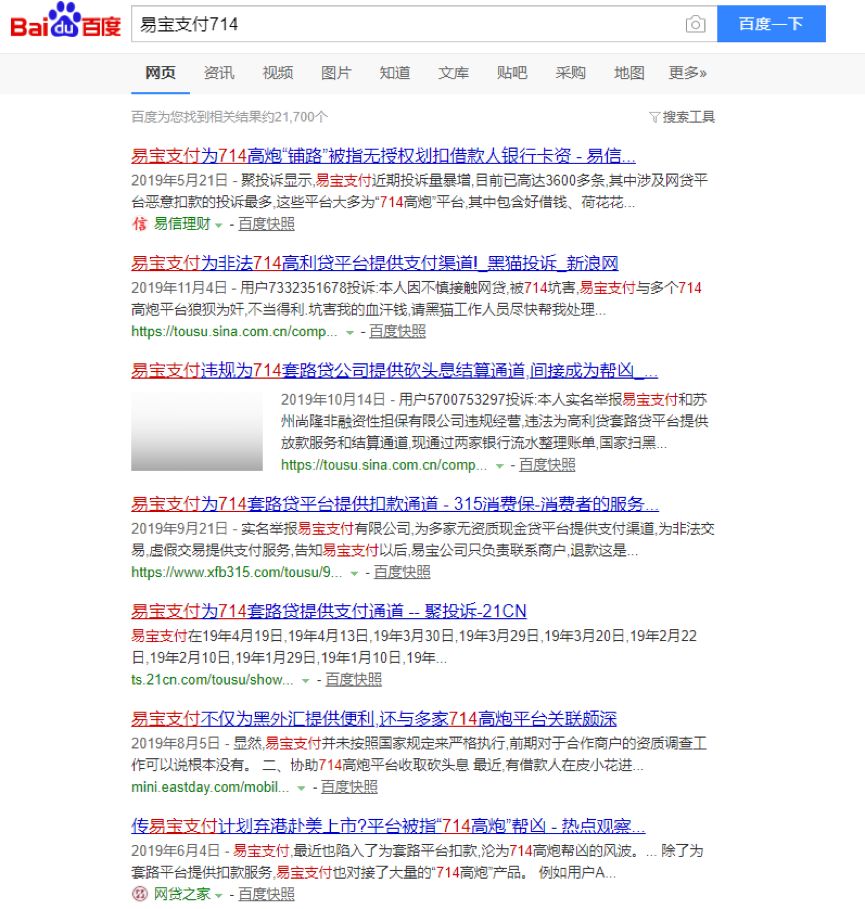 与无牌照经营的A公司不同,为其提供支付通道的易宝支付和宝付支付货真价实的持牌金融机构,而这两家公司常常被质疑为714高炮、套路贷提供服务。