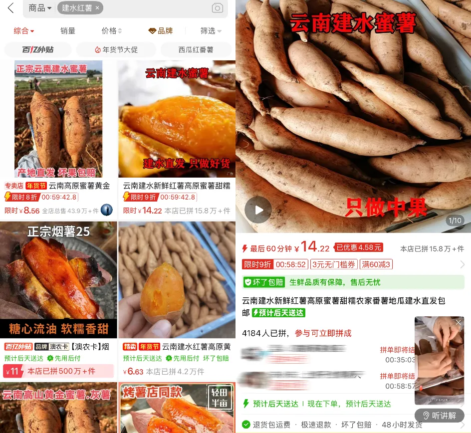 然而,截至1月27日,距离央视曝光已过去整整9天,拼多多等电商平台上“建水红薯”相关商品仍在正常售卖,详情页里依旧是诱人的宣传话术,对农药残留风险只字未提。