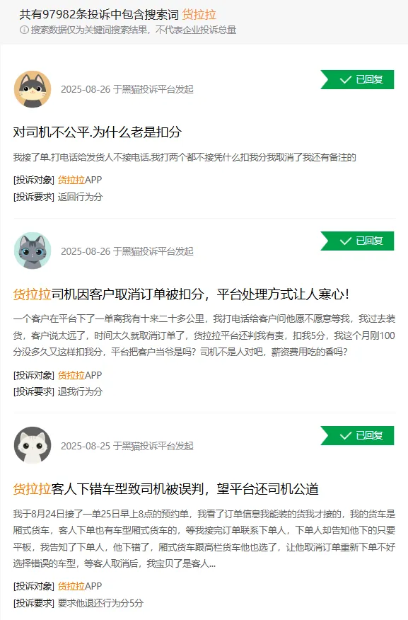 在黑猫投诉平台上,截至目前包含“货拉拉”关键词的投诉量高达97982条,其中大量投诉来自司机,涉及平台限制接单、克扣补贴或定金、抽佣比例畸高、恶意扣除行为分、恶意封号等问题。