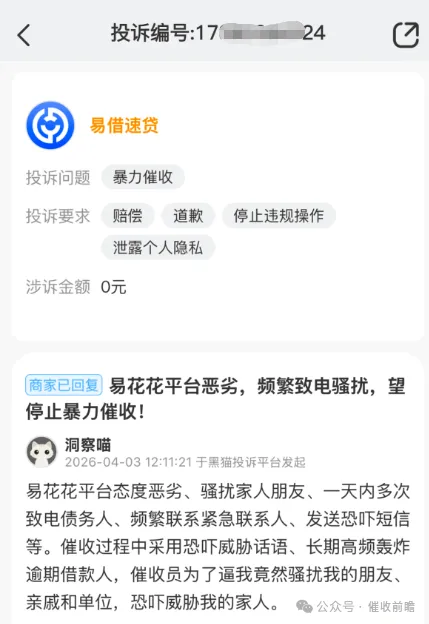 比变相砍头息更恶劣的是催收环节的严重失序。投诉信息显示,易花花在用户出现逾期或沟通不畅时,未采取合法合规的协商方式,反而频繁使用极端手段施压:客服态度蛮横恶劣,持续拨打恐吓短信,恶意骚扰借款人家人、朋友及同事,甚至联系借款人工作单位与亲属,以软暴力方式逼迫还款,严重干扰他人正常生活与工作秩序。此类行为不仅违背文明催收的行业基本准则,更涉嫌侵犯公民隐私权、名誉权,触碰法律红线。
