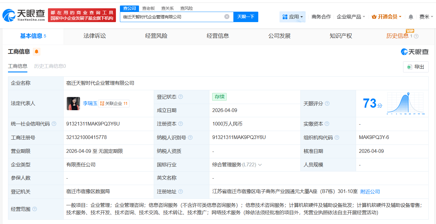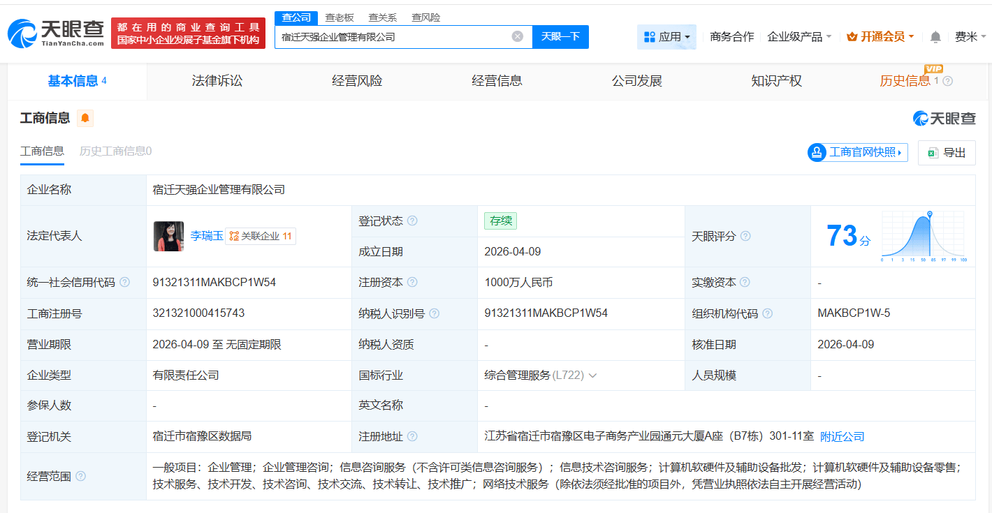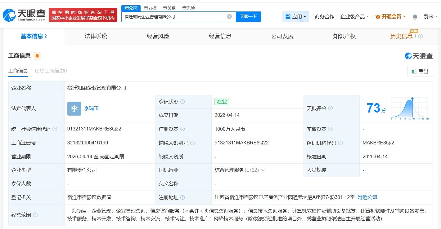 天眼查App显示,4月14日,宿迁知周企业管理有限公司成立,法定代表人为李瑞玉,注册资本1000万人民币,经营范围含企业管理、企业管理咨询、信息咨询服务等,由北京天强坤泰投资管理有限公司全资持股,后者由刘强东、章泽天共同持股。