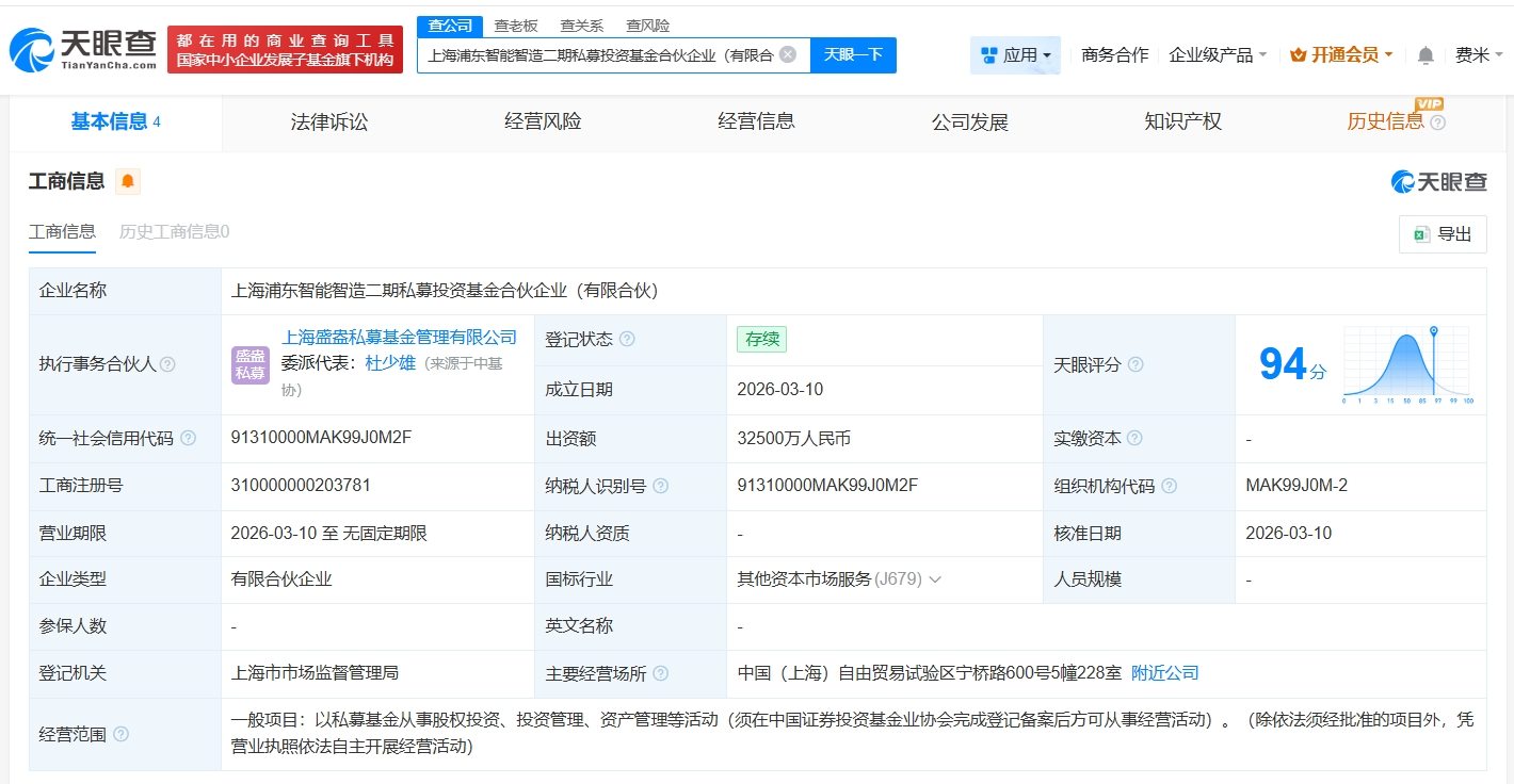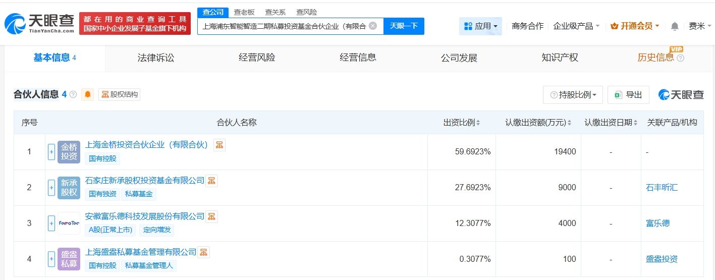 天眼查工商信息显示,近日,上海浦东智能智造二期私募投资基金合伙企业(有限合伙)成立,执行事务合伙人为上海盛盎私募基金管理有限公司,出资额3.25亿人民币,经营范围为以私募基金从事股权投资、投资管理、资产管理等活动。合伙人信息显示,该基金由上海金桥投资合伙企业(有限合伙)、石家庄新承股权投资基金有限公司、富乐德(301297)、上海盛盎私募基金管理有限公司共同出资。