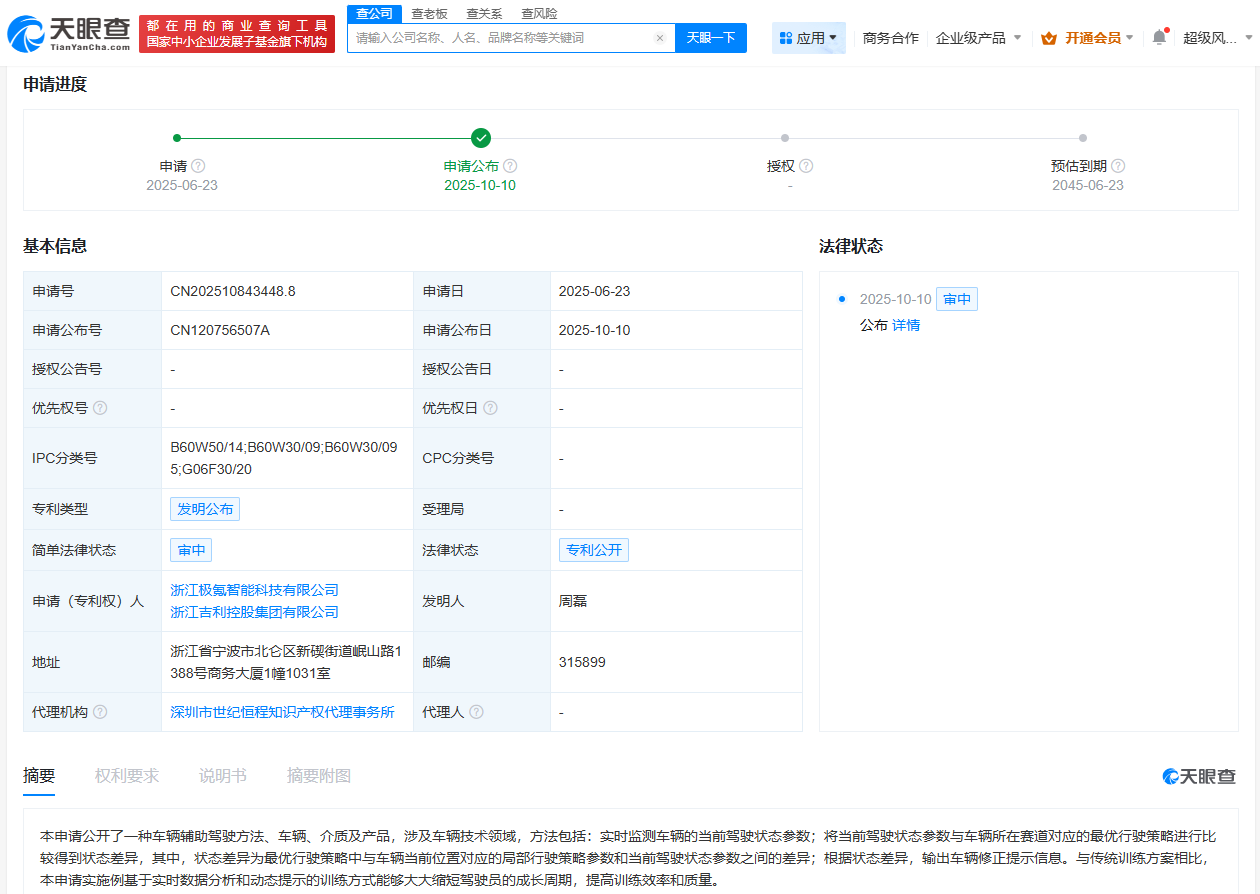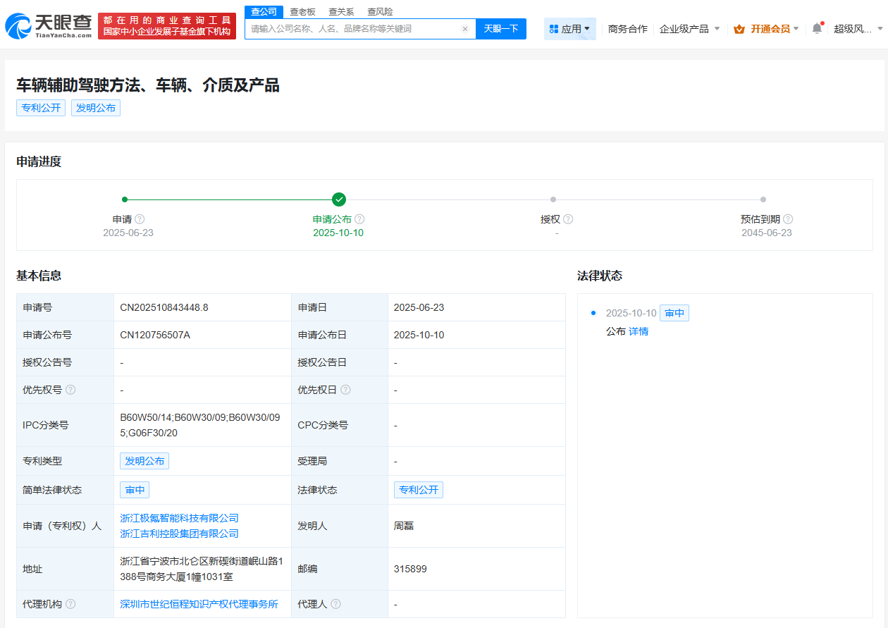 天眼查App显示,10月10日,浙江极氪智能科技有限公司、浙江吉利控股集团有限公司申请的“车辆辅助驾驶方法、车辆、介质及产品”专利公布。
