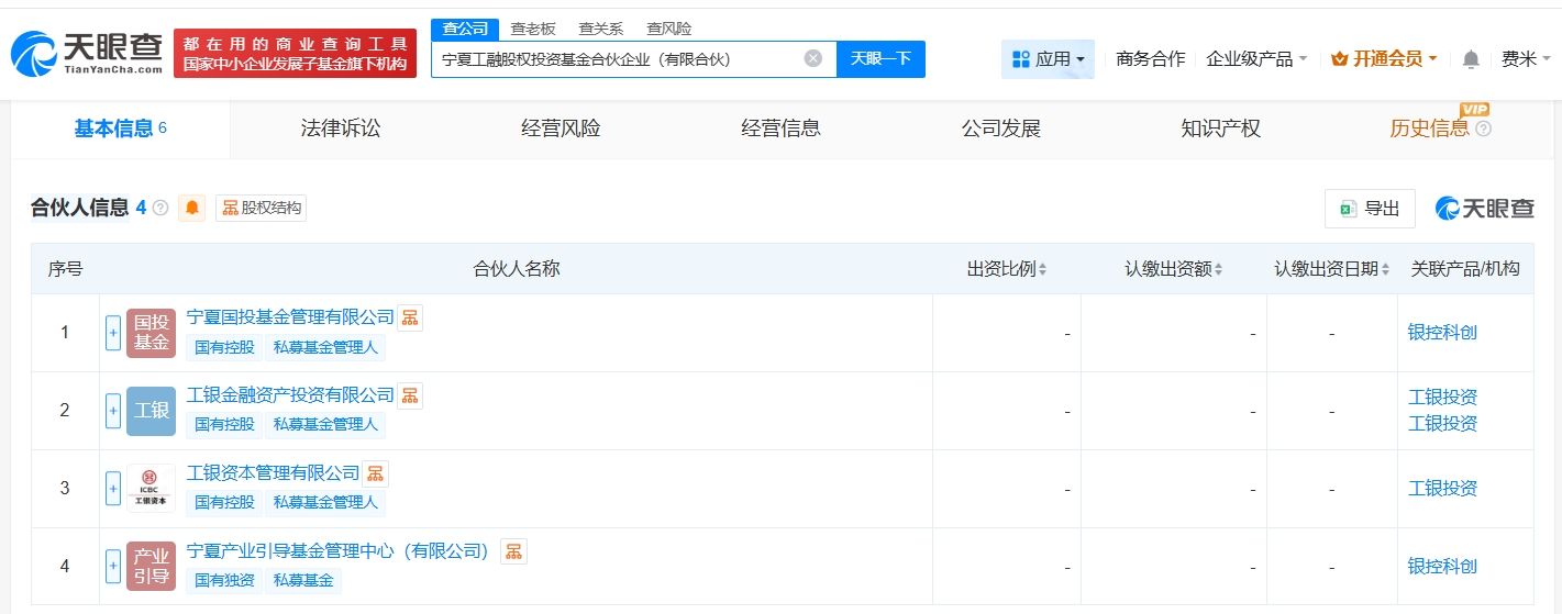天眼查工商信息显示,近日,宁夏工融股权投资基金合伙企业(有限合伙)成立,执行事务合伙人为工银资本管理有限公司,出资额10亿人民币,经营范围为以私募基金从事股权投资、投资管理、资产管理等活动。合伙人信息显示,该基金由宁夏国投基金管理有限公司、工银金融资产投资有限公司、工银资本管理有限公司、宁夏产业引导基金管理中心(有限公司)共同出资。