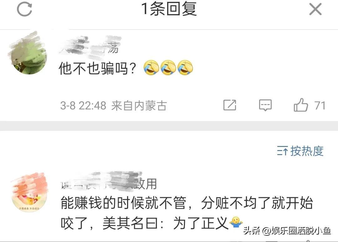 有的网友说,他不也骗吗?能赚钱的时候就不管,分赃不均了就开始咬了,美其名曰:为了正义。