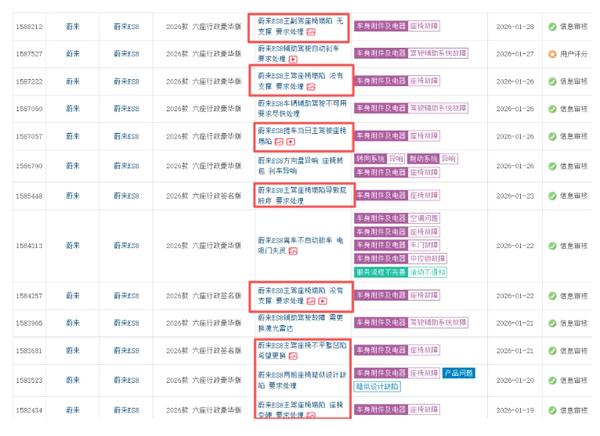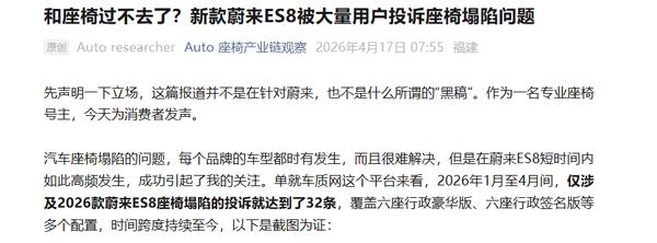 4月17日,据”Auto座椅产业链观察“消息,蔚来2026款ES8因座椅塌陷问题引发大量用户投诉,在车质网平台上,2026年1月至4月间,该车型座椅塌陷相关投诉达32条,涉及六座行政豪华版、六座行政签名版等多个配置版本。
