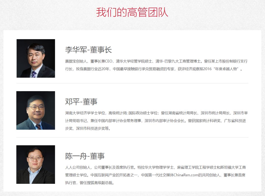 公开信息显示,票据宝是由深圳市票据宝金融服务有限公司运营的网络借贷信息中介服务平台。工商信息显示,票据宝创始人、董事长兼CEO李华军持有公司近90%的股权,另10%为人人公司旗下公司北京千象怡欣科技发展有限公司持有,人人公司创始人陈一舟同时担任票据宝的董事。