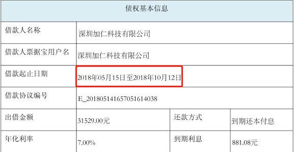 有一个借款人为深圳加仁科技有限公司,其在票据宝平台上发起了为时5个月的借款,约定还款日期为2018年10月12日。