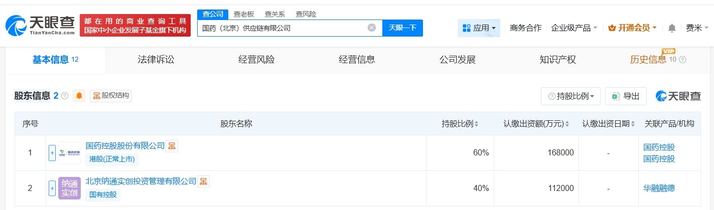 天眼查App显示,近日,国药(北京)供应链有限公司成立,法定代表人为李杨,注册资本28亿人民币,经营范围为供应链管理服务,技术服务、技术开发、技术咨询、技术交流、技术转让、技术推广,由国药控股(01099.HK)、北京纳通实创投资管理有限公司共同持股。