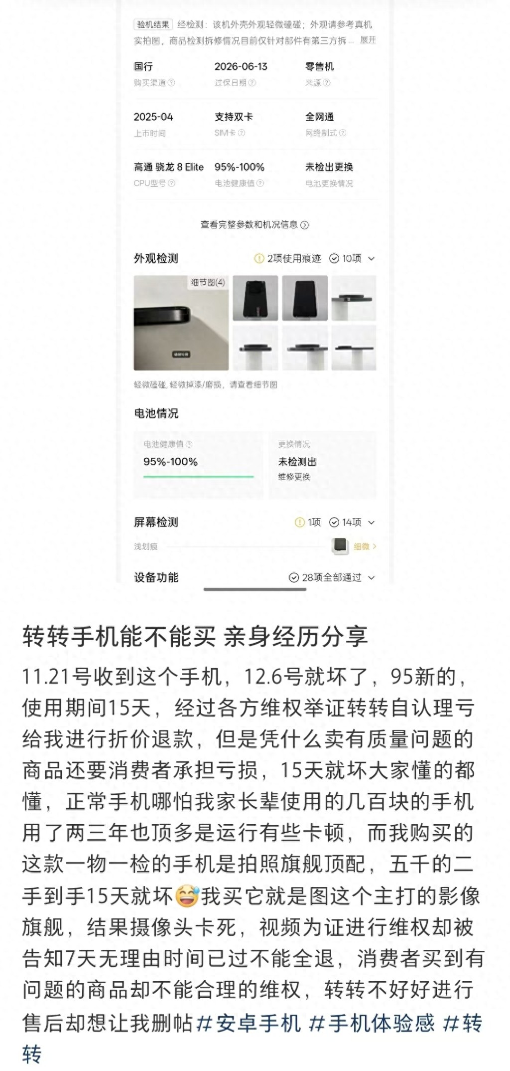 今年11月,江女士在转转上花费5028元,购买了一部vivo X200 Ultra二手手机。11月20日收到货,没想到12月6日手机却出现了故障。