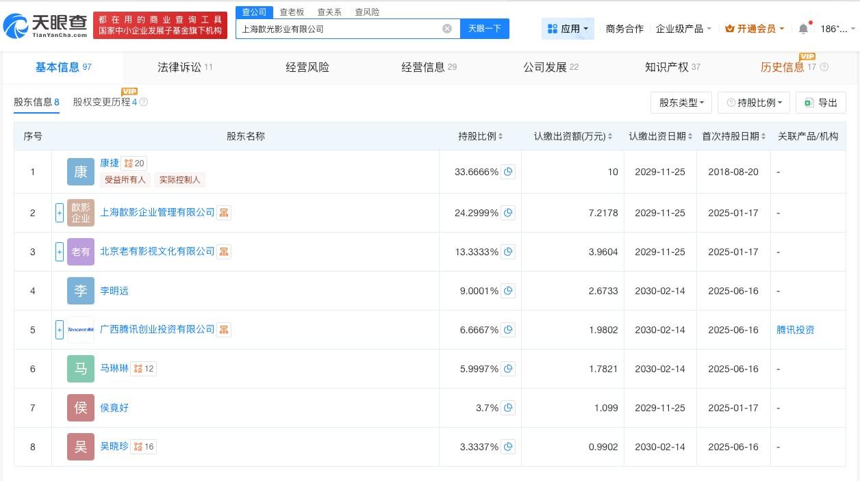 天眼查App显示,上海歆光影业有限公司成立于2018年8月,法定代表人为康捷,注册资本约29.7万人民币,经营范围包括电影制片、组织文化艺术交流活动、市场营销策划等,由康捷、上海歆影企业管理有限公司、广西腾讯创业投资有限公司等共同持股。