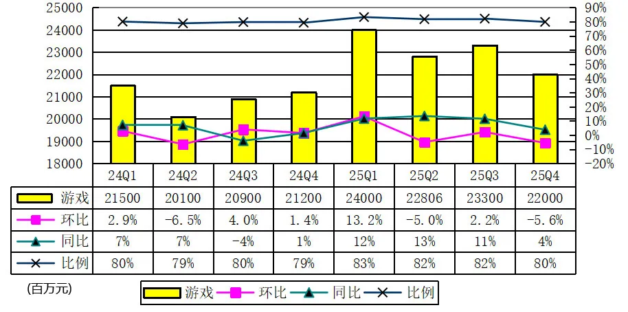 从财报数据看,2025年Q4网易游戏业务收入220亿元,占总营收80%,而有道、网易云音乐、创新业务及其他三大非游戏业务合计仅贡献56亿元,占比仅20%,结构失衡极为突出。尽管网易近年持续加码非游戏业务,试图降低对游戏的依赖,但2025年转型成效不明显,非游戏业务仍难以扛旗。