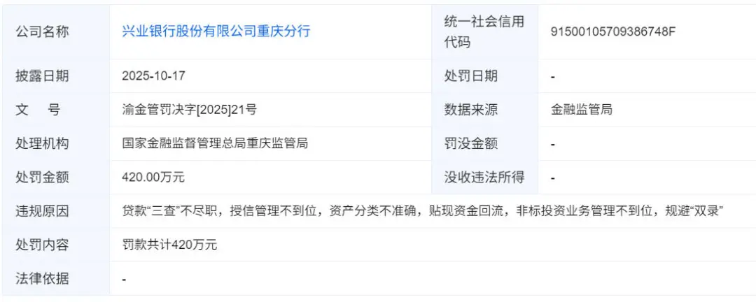 从处罚金额来看,单家分支机构最高罚款达420万元。10月17日,兴业银行重庆分行因“贷款‘三查’不尽职,授信管理不到位,资产分类不准确,贴现资金回流,非标投资业务管理不到位,规避‘双录’”,被罚款共计420万元。李妮(时任兴业银行重庆渝中支行行长)、武毅(时任兴业银行重庆分行企业金融南岸业务总部总裁)、舒琴(时任兴业银行重庆加州支行行长)、王衡(时任兴业银行重庆分行企业金融南岸业务一部总监)被警告、邓珂(时任兴业银行重庆分行营业部总经理)被罚款5万元。