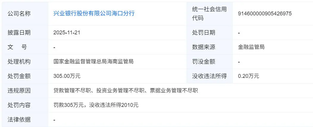 紧随其后的是兴业银行海口分行,11月21日,因“贷款管理不尽职、投资业务管理不尽职、票据业务管理不尽职”等违法违规行为,被罚款305万元,没收违法所得2010元。黎规群、吴刚被警告并罚款共计18万元;谢红卫、邢诒深、李伟被警告。