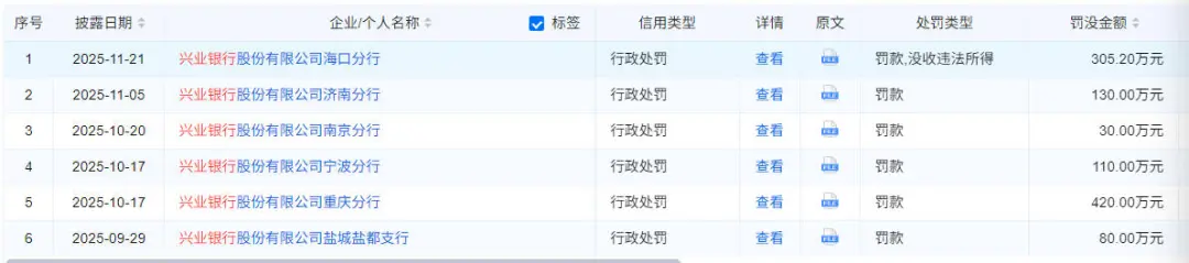 当监管机构在2025年前11个月对兴业银行累计罚没金额近2500万元且百万级罚单达9张时,这家总资产超10万亿的股份制银行或已暴露出合规失序。