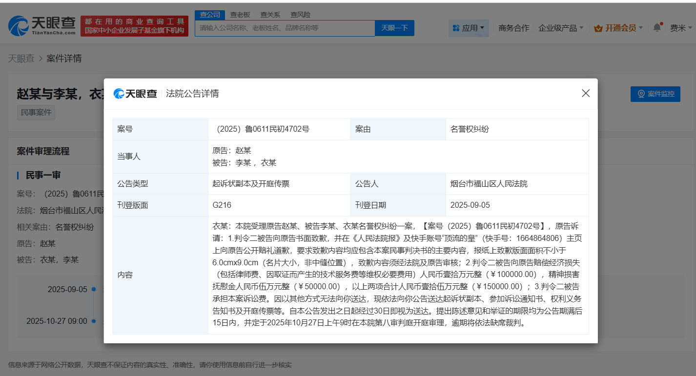 天眼查天眼风险信息显示,近日,烟台市福山区人民法院向衣某公告送达起诉状副本、开庭传票等,涉及原告赵丽颖与被告李某、衣某名誉权纠纷一案,该案将于10月27日开庭审理。