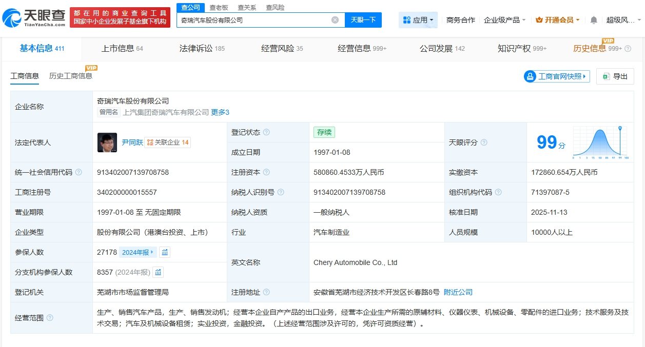 天眼查App显示,近日,奇瑞汽车股份有限公司发生工商变更,注册资本由约54.7亿人民币增至约58.1亿人民币,增幅约6%。