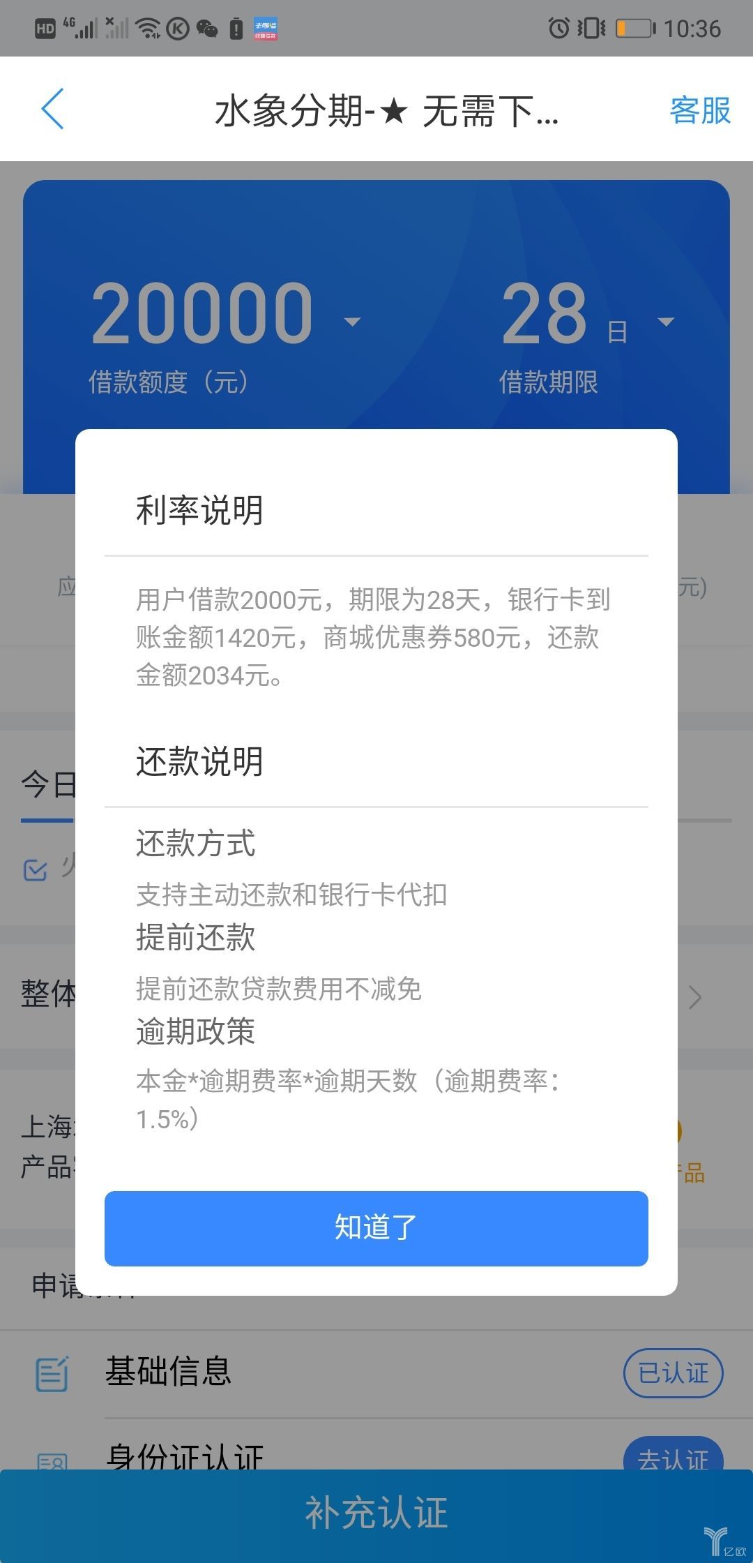 事实上,亿欧金融曾在某贷款超市体验过水象分期这一平台,当时水象分期打着“商城优惠券”的名义收取用户砍头息。用户借款2000元,期限为28天,实际到帐1420元,其余的580元被分配为商城优惠券,到期一次性还款2034元,经计算其实际年化利率为564%,超过监管规定15.7倍。