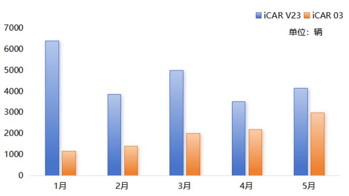 iCAR V23今年1月销量曾突破6000辆,5月则回落至4000余辆;反观iCAR 03,同期销量则从1000辆左右稳步攀升至近3000辆。
