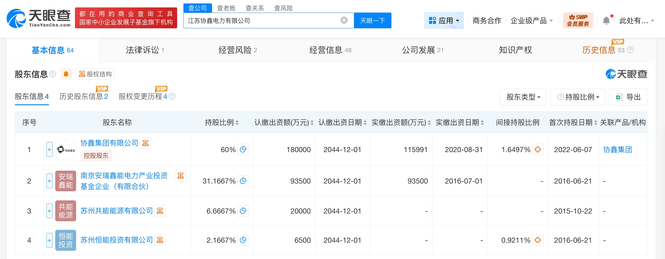 天眼查App显示,近日,协鑫集团有限公司新增一则股权冻结信息,股权所在企业为江苏协鑫电力有限公司,冻结股权数额18亿人民币,冻结期限3年,执行法院为江西省南昌市中级人民法院。