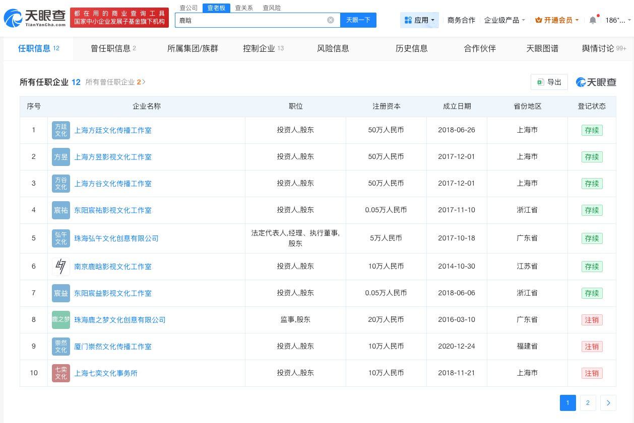 天眼查App显示,鹿晗共关联12家企业,其中7家为存续状态,包括珠海弘午文化创意有限公司和6家工作室,均为影视文化、文化创意、文化传播相关。