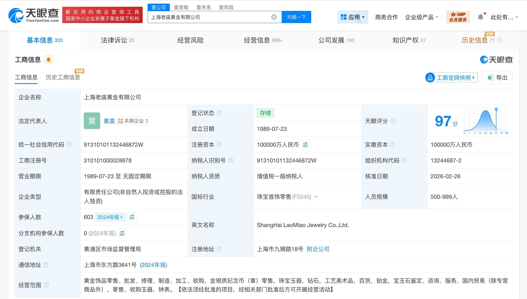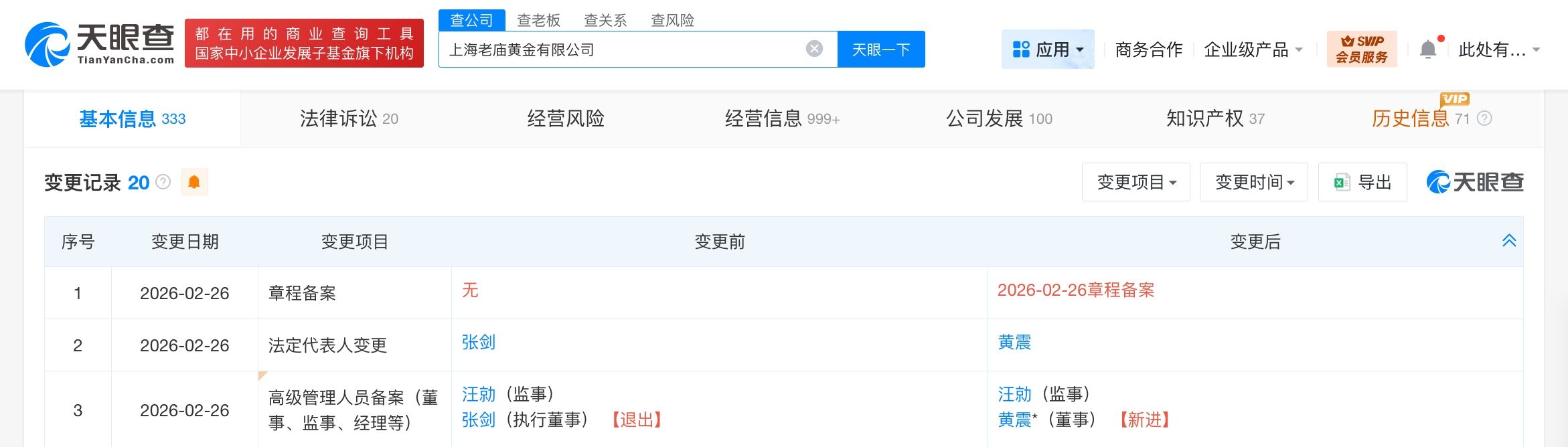 天眼查App显示,近日,上海老庙黄金有限公司发生工商变更,张剑卸任法定代表人、执行董事,由黄震接任法定代表人并担任董事。