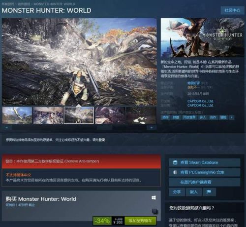 《怪物猎人世界》是由CAPCOM制作发行的一款动作冒险游戏,很多玩家都因为这款游戏画质不清楚而抱怨纷纷。而现在,Steam版本的《怪物猎人世界》高清材质包DLC已经正式上线,玩家们可以在游戏商店里进行免费下载,并在选项里的画面详细设定里进行选择。目前游戏也在Steam上开启6.6折特惠,标准版售价203元,豪华版售价270元。喜欢的玩家可以购买了。