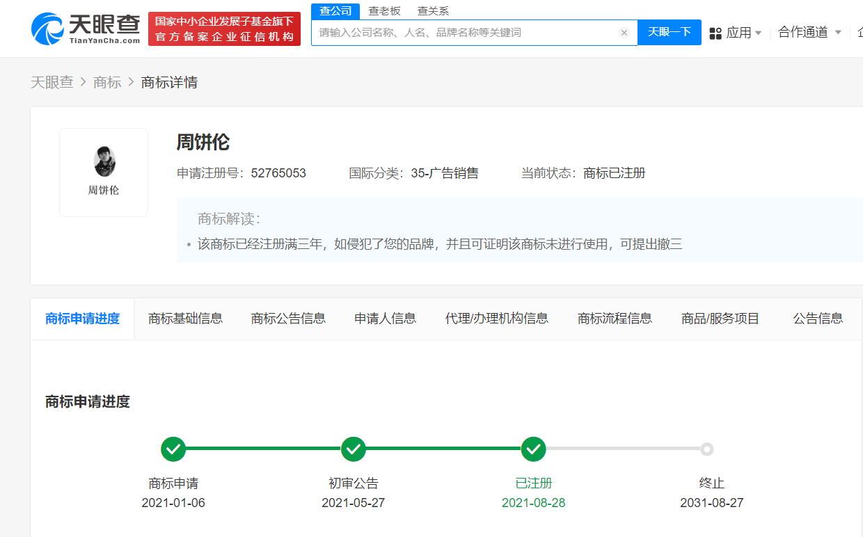 天眼查App显示,9月11日,天津市和平区舟饼伦快餐店(个体工商户)成立,经营者为白献英,经营范围为餐饮服务。值得一提的是,白献英已申请注册多枚“周饼伦”“粥饼伦”“舟饼伦”“粥饼轮”文字及图形商标,当前上述商标多多数已注册成功。
