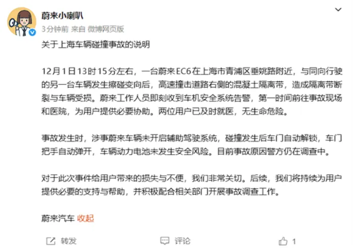 12月1日,上海沪青平公路上一辆蔚来EC6与同向行驶的另一车辆发生擦碰后变向,高速撞击道路右侧的混凝土隔离带。