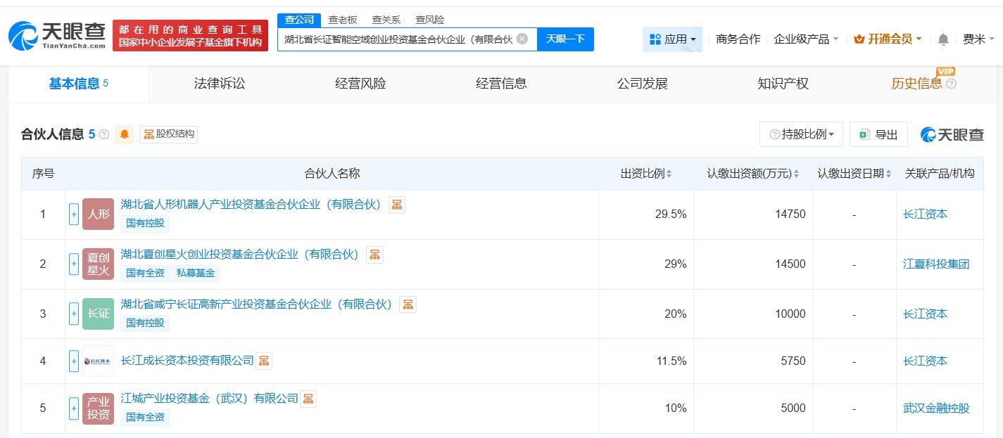 天眼查App显示,近日,湖北省长证智能空域创业投资基金合伙企业(有限合伙)成立,执行事务合伙人为长江成长资本投资有限公司,出资额5亿人民币,经营范围为私募股权投资基金管理、创业投资基金管理服务,创业投资,由湖北省人形机器人产业投资基金合伙企业(有限合伙)、湖北夏创星火创业投资基金合伙企业(有限合伙)、湖北省咸宁长证高新产业投资基金合伙企业(有限合伙)等共同出资。