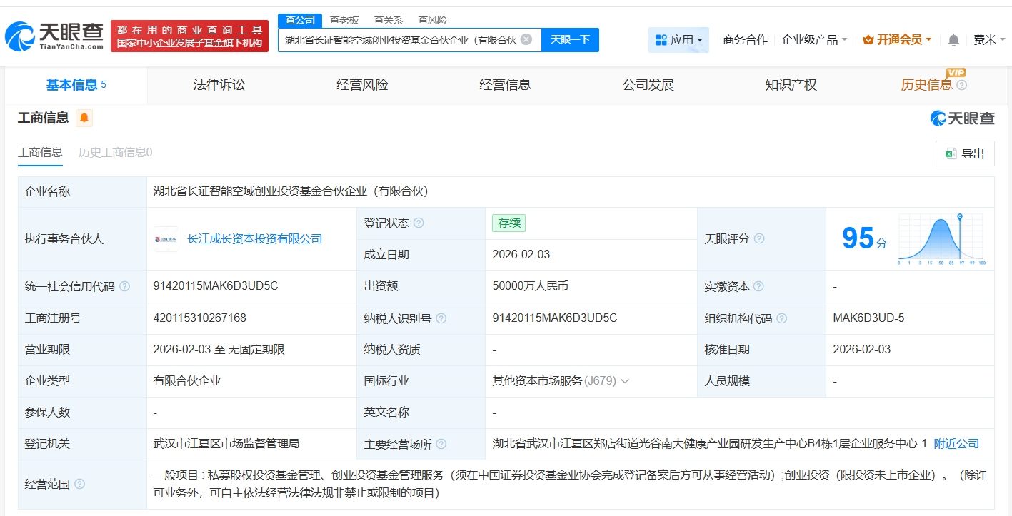,近日,湖北省长证智能空域创业投资基金合伙企业(有限合伙)成立,执行事务合伙人为长江成长资本投资有限公司,出资额5亿人民币,经营范围为私募股权投资基金管理、创业投资基金管理服务,创业投资,由湖北省人形机器人产业投资基金合伙企业(有限合伙)、湖北夏创星火创业投资基金合伙企业(有限合伙)、湖北省咸宁长证高新产业投资基金合伙企业(有限合伙)等共同出资。