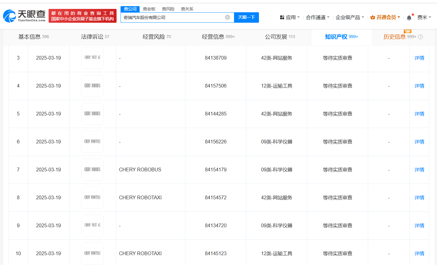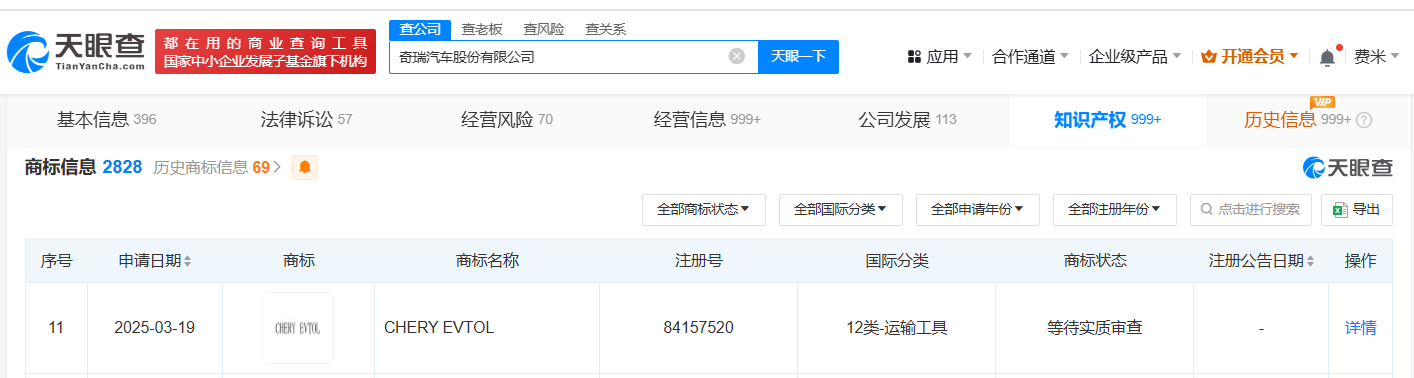天眼查知识产权信息显示,近日,奇瑞汽车股份有限公司申请注册“CHERY NEXT AI”“CHERY ROBOBUS”“CHERY ROBOTAXI”“CHERY EVTOL”商标,国际分类为网站服务、运输工具、科学仪器,当前商标状态均为等待实质审查。