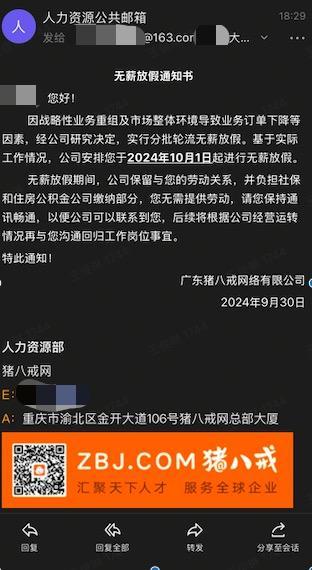 同时,有部分员工收到“无薪放假”通知。据相关员工提供的《无薪放假通知书》邮件,猪八戒网人力资源在邮件中称“因战略性业务重组及市场整体环境导致业务订单下降等因素,经公司研究决定,实行分批轮流无薪放假”。