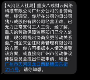 近日,广东猪八戒网络有限公司、重庆八戒财云网络科技有限公司员工向南都湾财社记者表示,猪八戒网广州分部有多名员工申请劳动仲裁,原因是公司今年9月份起就没发工资了,且有员工收到了公司的“无薪放假”邮件,并被“移”出了公司系统。