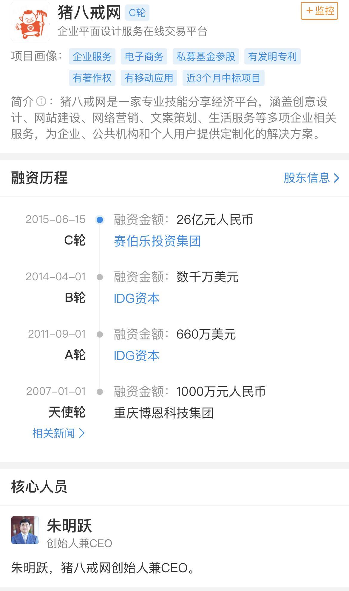 长期亏损的猪八戒网,只能靠融资持续经营。企查查数据显示,公司分别于2011年、2014年以及2015年展开了A轮、B轮以及C轮融资,其中C轮融资达26亿元,由赛伯乐投资集团等投资。