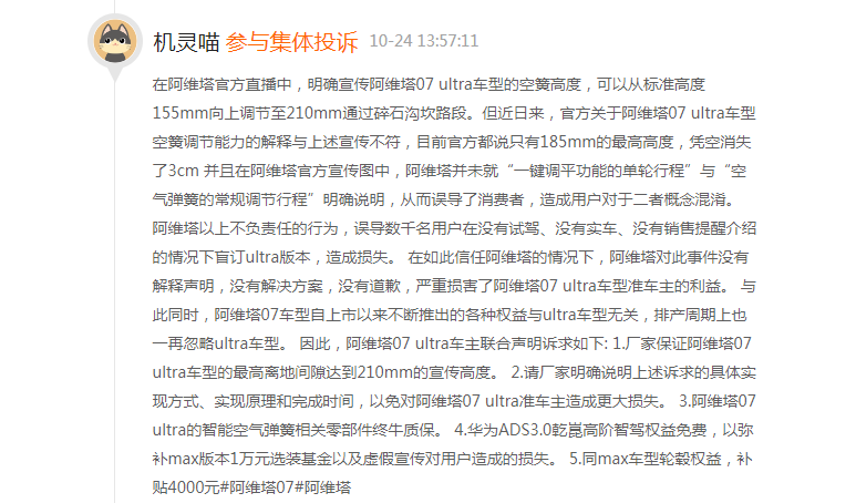 其中,一位车主投诉称,在阿维塔官方直播中,明确宣传阿维塔07 ultra车型的空簧高度,可以从标准高度155mm向上调节至210mm通过碎石沟坎路段。