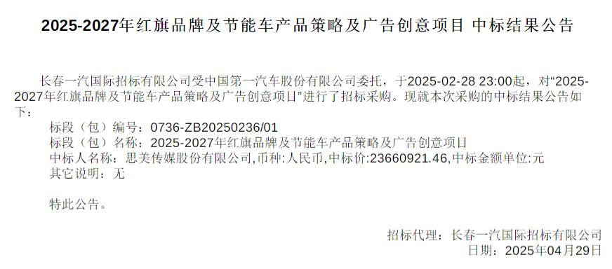 2025年04月29日,长春一汽国际招标有限公司发布中标结果公告,表明思美传媒股份有限公司为此次项目的中标人。