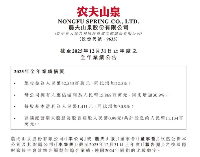 农夫山泉2025年业绩亮眼,茶饮料收入超包装水,实现转型与盈利双增长。