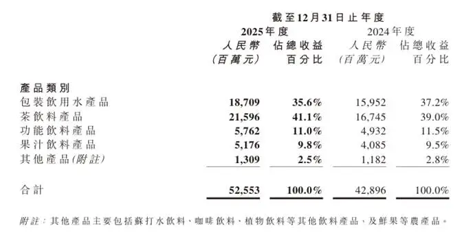 2025年,农夫山泉茶饮料的销售金额第一次超过包装饮用水,成为公司的第一大业务板块,其也正式由“水企”转型为“水+茶”双轮驱动的综合型饮料企业。