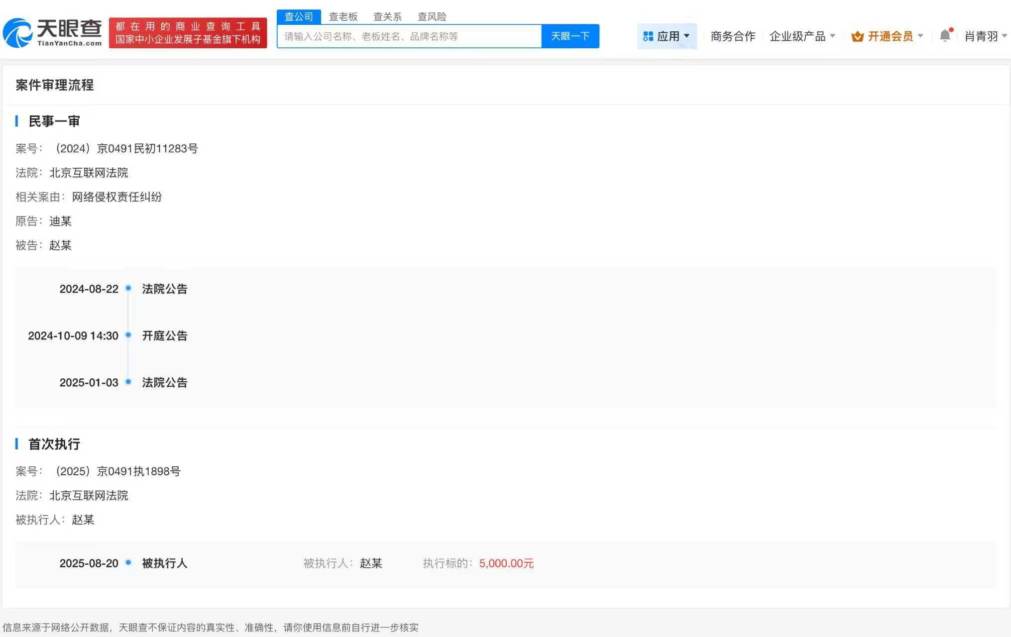 近日,赵某新增一则被执行人信息,执行标的5000元,涉及迪丽热巴·迪力木拉提与其网络侵权责任纠纷一案,执行法院为北京互联网法院。