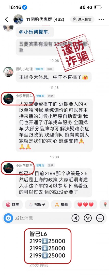 根据智己汽车官方放出的图片来看,在名为“11 团购优惠群”的群聊中,群内管理员发布了智己 L6 汽车优惠活动,表示智己 L6 汽车“目前 2199 那个政策是 2.5”。