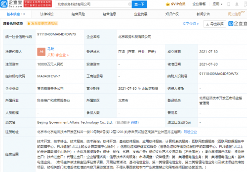 【TechWeb】企查查APP显示,7月30日,北京政务科技有限公司成立,法定代表人为马跃,注册资本1亿元人民币,经营范围包含:市场调查;设备租赁;第二类增值电信业务;第一类增值电信业务;基础电信业务等。